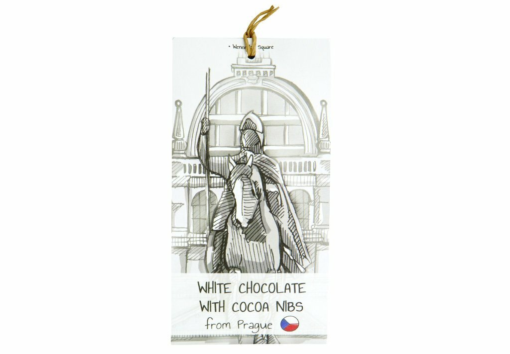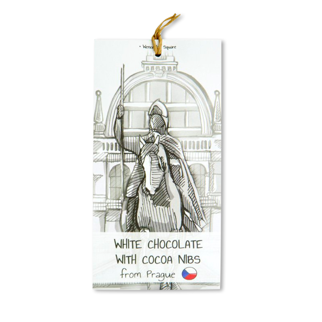 Limitovaná edice - pozdrav z Prahy od Čokoláda.cz Bílá čokoláda s kousky kakaových bobů. Tentokrát s naším vlastním obalem - motivem Sv. Václava na Václavském náměstí.